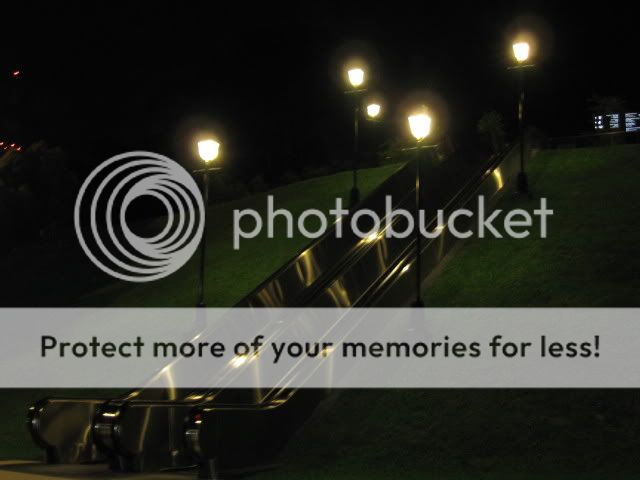 Floor lights give the brick red and white exterior a somewhat eerie glow..